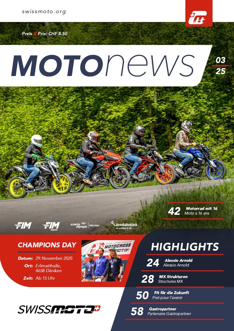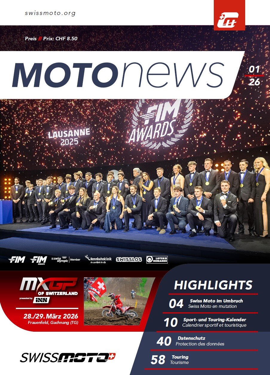 Viermal im Jahr erscheint die offizielle Swiss Moto Verbandszeitung, in der die neuesten Entwicklungen im Verband, der Sportwelt, dem Touring-Bereich und der Mobilität präsentiert werden. Ab 2025 enthält jede Ausgabe zudem einen Bericht aus unseren Kantonalverbänden im Tessin und Wallis.